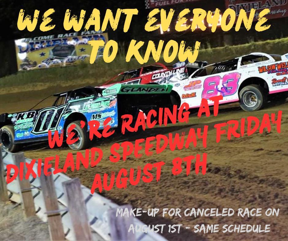 Last night's canceled race at Dixieland Speedway has been rescheduled for Friday, August 8th. Same race schedule.